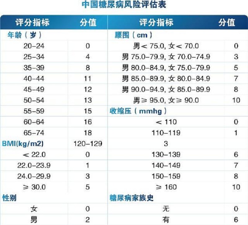 中國糖尿病風(fēng)險(xiǎn)評估表:根據(jù)下表計(jì)算分?jǐn)?shù),了解你是否有換上二型糖尿病的風(fēng)險(xiǎn),風(fēng)險(xiǎn)評估數(shù)值<25,低風(fēng)險(xiǎn);≥25,高風(fēng)險(xiǎn);