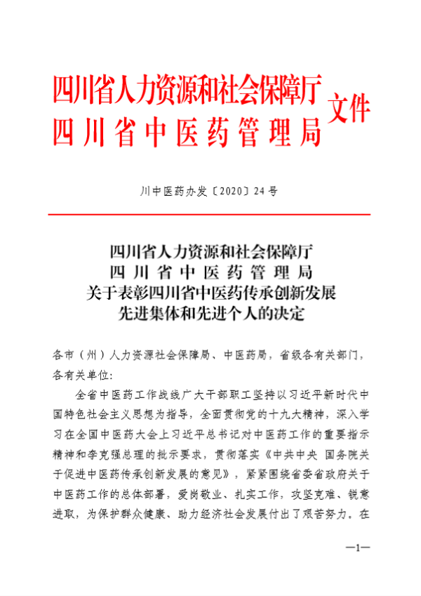 關(guān)于表彰四川省中醫(yī)藥傳承創(chuàng)新發(fā)展先進(jìn)集體和先進(jìn)個人的決定