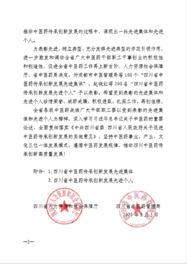 為表彰先進(jìn),樹立典型,充分發(fā)揮先進(jìn)典型的示范引領(lǐng)作用, 進(jìn)一步激發(fā)和調(diào)動全省廣大中醫(yī)藥干部職工干事創(chuàng)業(yè)的積極性和創(chuàng)造性,促進(jìn)全省中醫(yī)藥工作再上新臺階,人力資源社會保障廳、省中醫(yī)藥局決定,對成都市中醫(yī)管理局等 100 個“四川省中醫(yī)藥傳承創(chuàng)新發(fā)展先進(jìn)集體”、趙曉紅等 200 名“四川省中醫(yī)藥傳承創(chuàng)新發(fā)展先進(jìn)個人”予以表彰。希望受到表彰的先進(jìn)集體和先進(jìn)個人珍惜榮譽,戒驕戒躁,積極進(jìn)取,扎實工作,再創(chuàng)佳績。