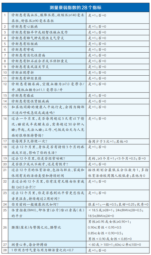 那么,如何計(jì)算自己的衰弱程度呢?研究規(guī)定,衰弱指數(shù)等于個(gè)體符合的疾病或缺陷數(shù),除以納入的疾病或缺陷總數(shù)(即28個(gè))。也就是說(shuō),如果一個(gè)人滿足或達(dá)到上述指標(biāo)中的至少7項(xiàng),身體狀況就可能到了衰弱期。