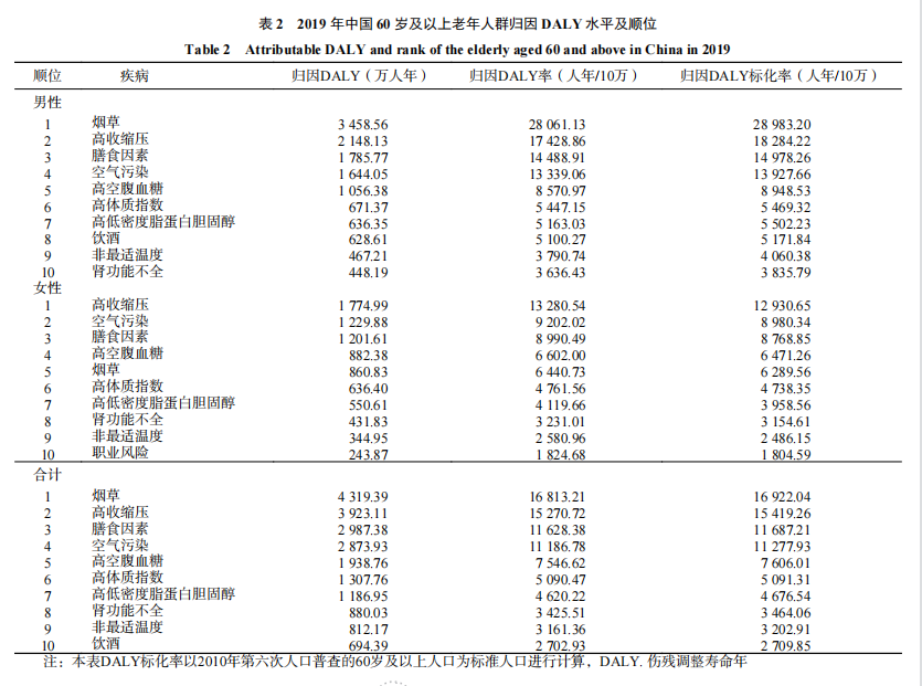 另外,與2009年相比,2019年影響中國60歲及以上老年人群健康的危險(xiǎn)因素順序也發(fā)生了變化。其中,膳食因素、高體質(zhì)指數(shù)、腎功能不全和飲酒的順位有所提高,而空氣污染、高低密度脂蛋白膽固醇和非最適溫度的順位出現(xiàn)下降。
