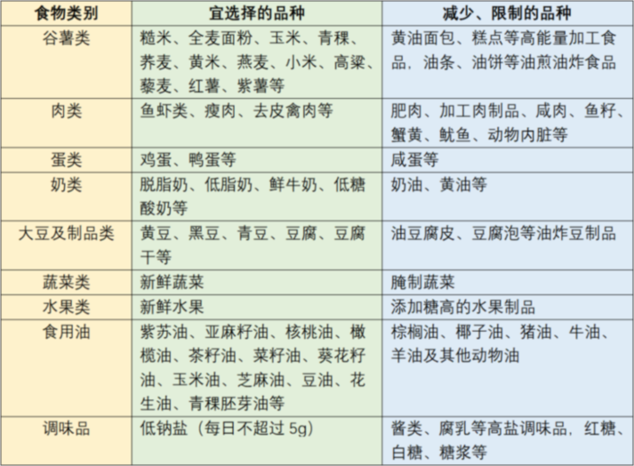 平衡膳食,食物多樣,食物種類(lèi)每日不少于12種,每周不少于25種。應(yīng)攝入充足蛋白質(zhì),選擇脂肪含量較低的魚(yú)蝦、去皮禽肉、瘦肉等,奶類(lèi)可選擇脫脂或低脂牛奶。提高大豆蛋白的攝入,每日攝入25g大豆蛋白,可降低心血管疾病的發(fā)生風(fēng)險(xiǎn)。