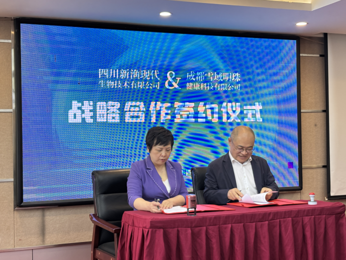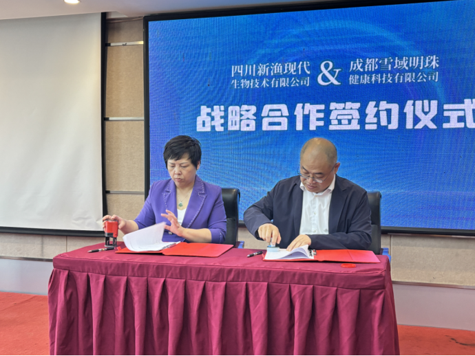 2025年4月29日,四川新漁現(xiàn)代生物技術有限公司與成都雪域明珠健康科技有限公司在眉山正式簽署戰(zhàn)略合作協(xié)議。雙方秉持“資源共享、共謀發(fā)展、共創(chuàng)共建”原則,聚焦高原人群健康領域,在慢病研究、品牌推廣等多維度展開深度合作,攜手推動分子營養(yǎng)與藏區(qū)醫(yī)療資源的創(chuàng)新融合。