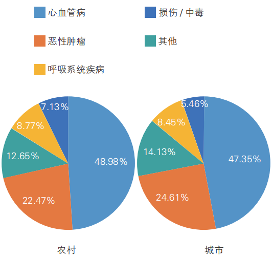 城鄉(xiāng)居民疾病死亡構(gòu)成比中,心血管病占首位。2021年,心血管病分別占農(nóng)村、城市死因的48.98%和47.35%(圖1)。