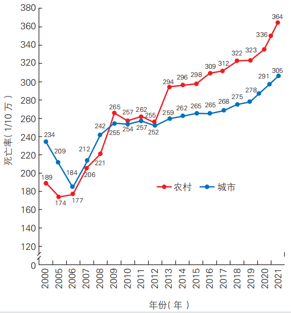 2003~2021年,中國腦血管病死亡率整體呈增長趨勢,與2003年相比,2021年城市腦血管病死亡率上升1.37倍;農(nóng)村上升1.58倍。各年度農(nóng)村腦血管病粗死亡率均高于城市。